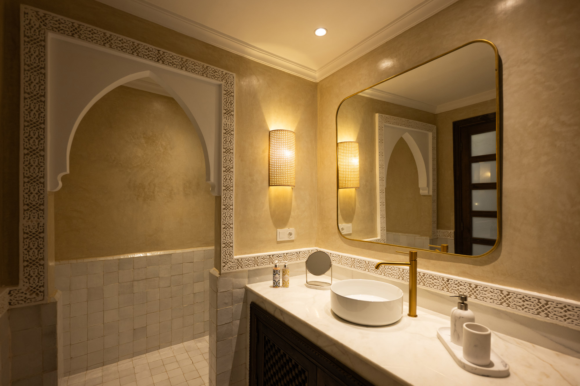 Une chambre luxueuse et raffinée, offrant une vue sur le patio et la piscine. L’artisanat marocain authentique se mêle avec subtilité à la modernité pour créer un équilibre parfait entre tradition et confort contemporain.